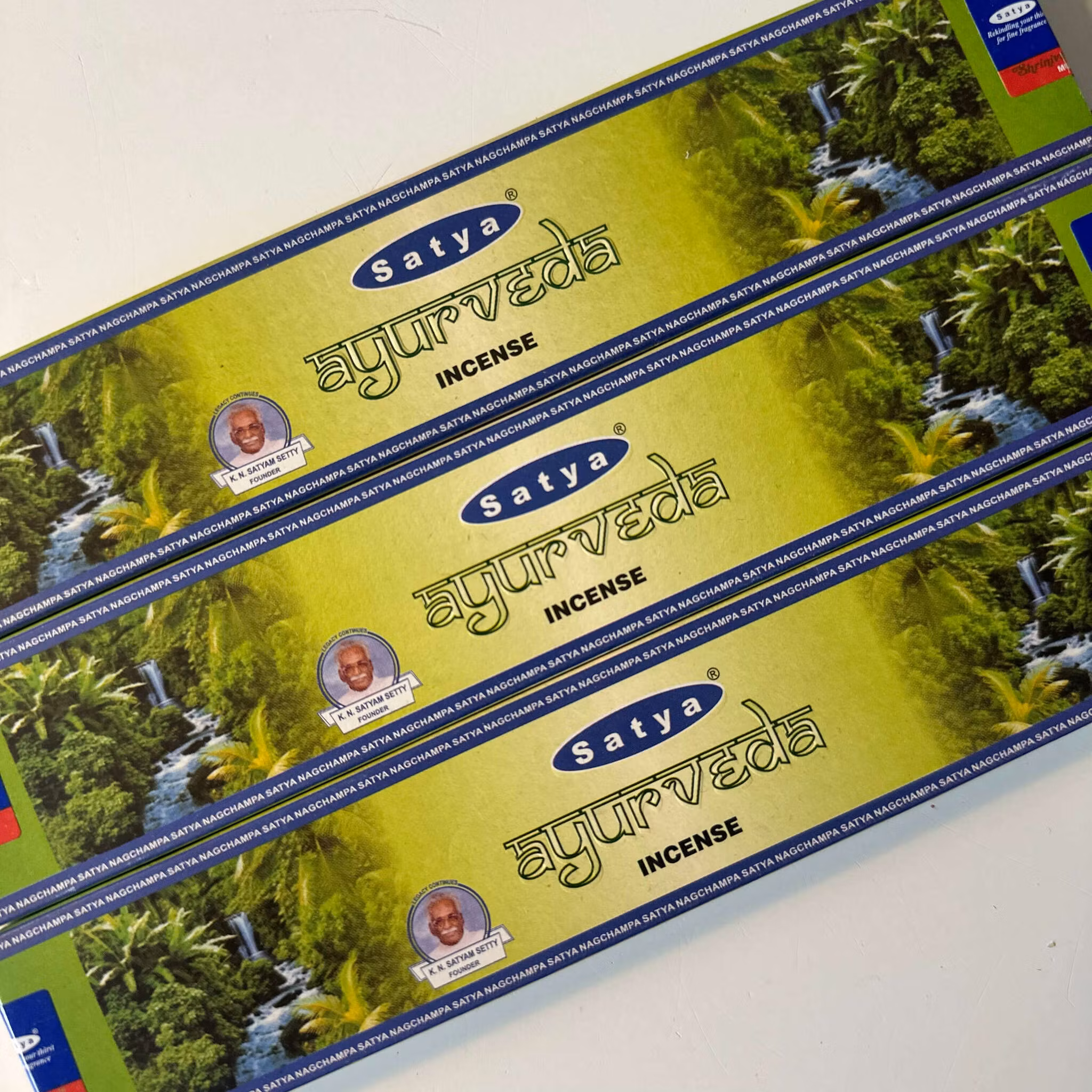 Satya rökelsestickor med doft av Ayurveda skapar en fridfull atmosfär för helande, Ayurveda är en indisk läkekonst.
