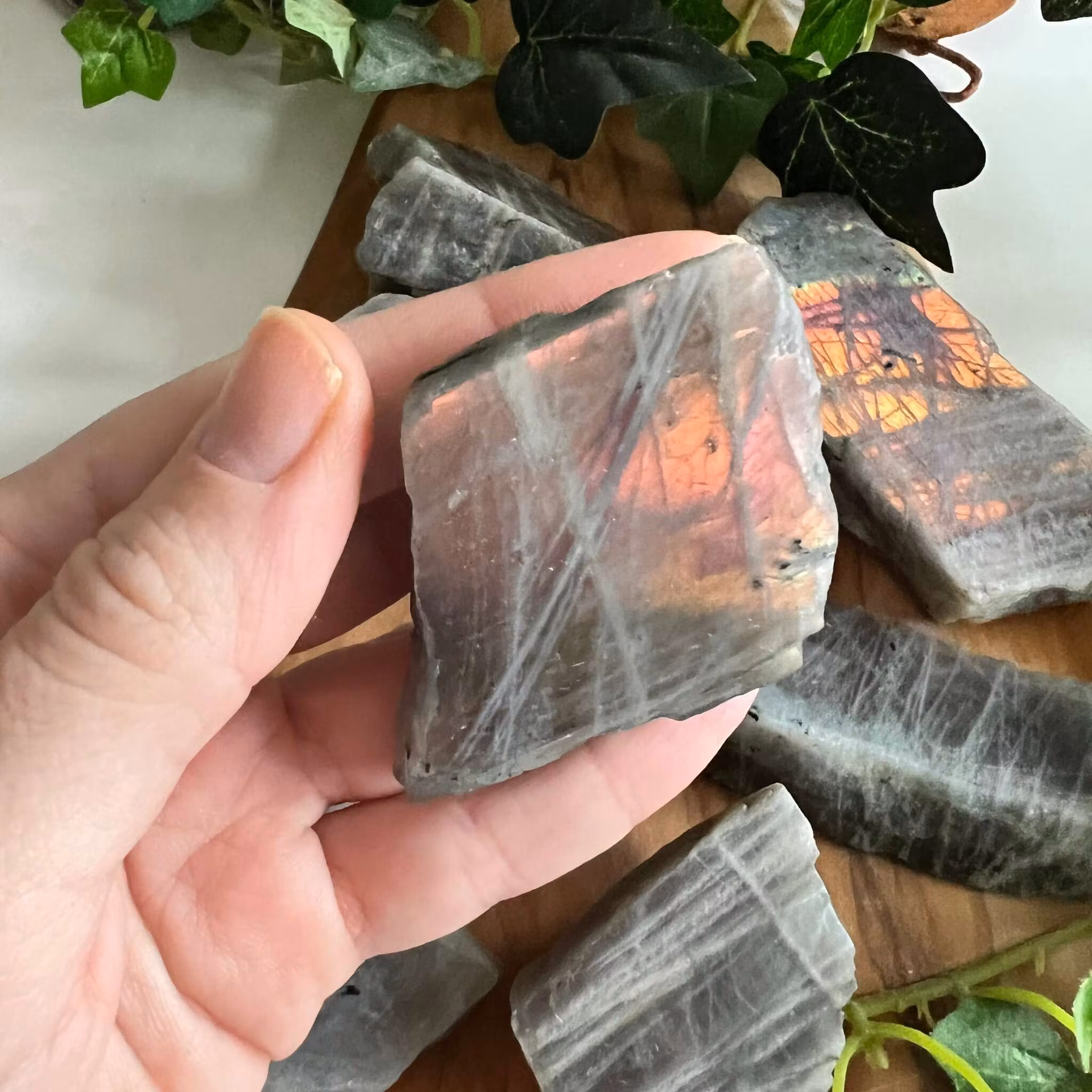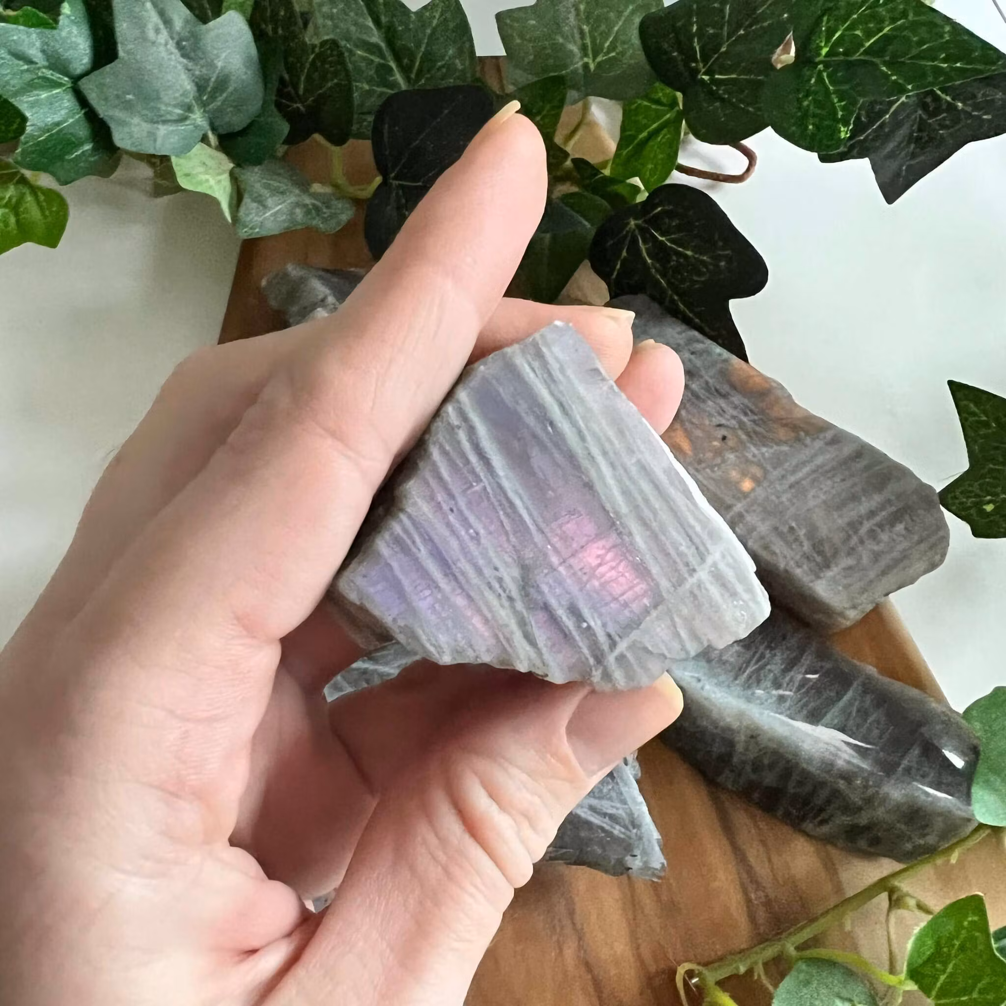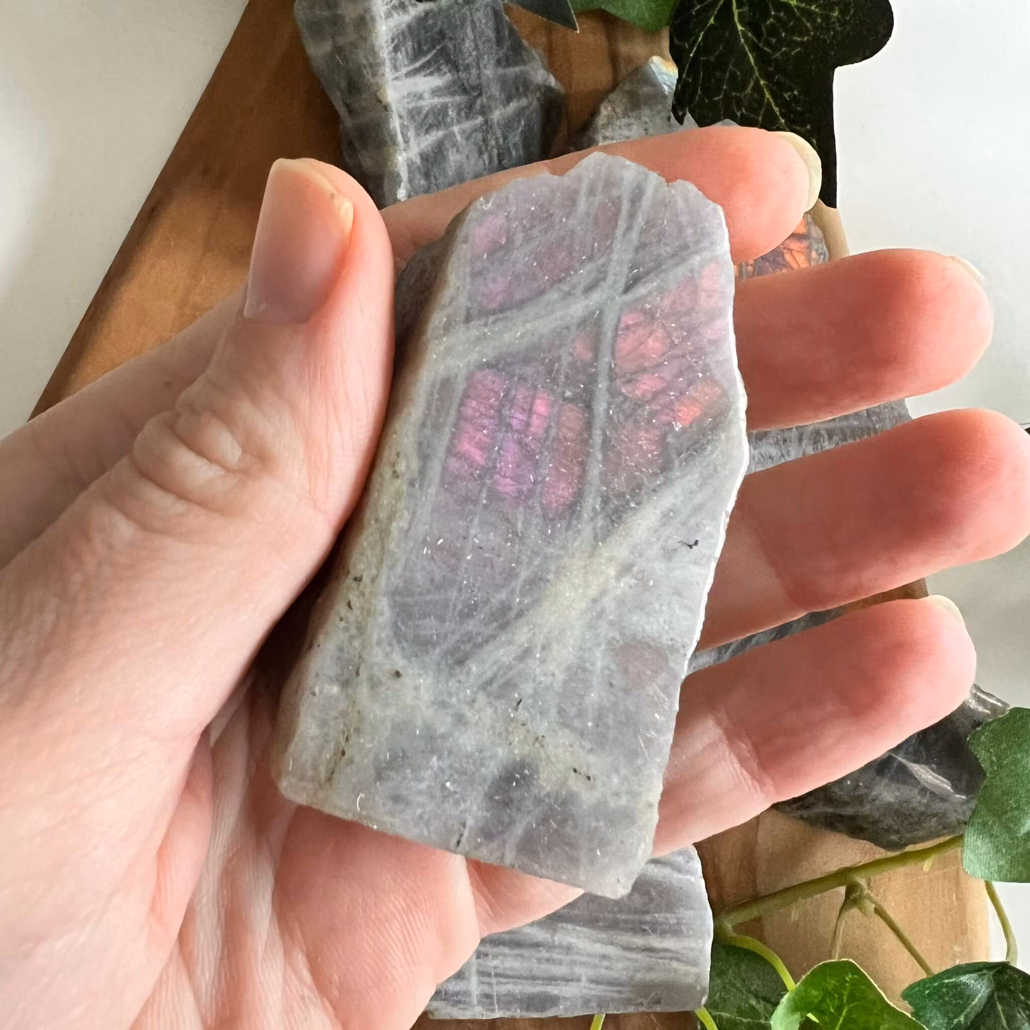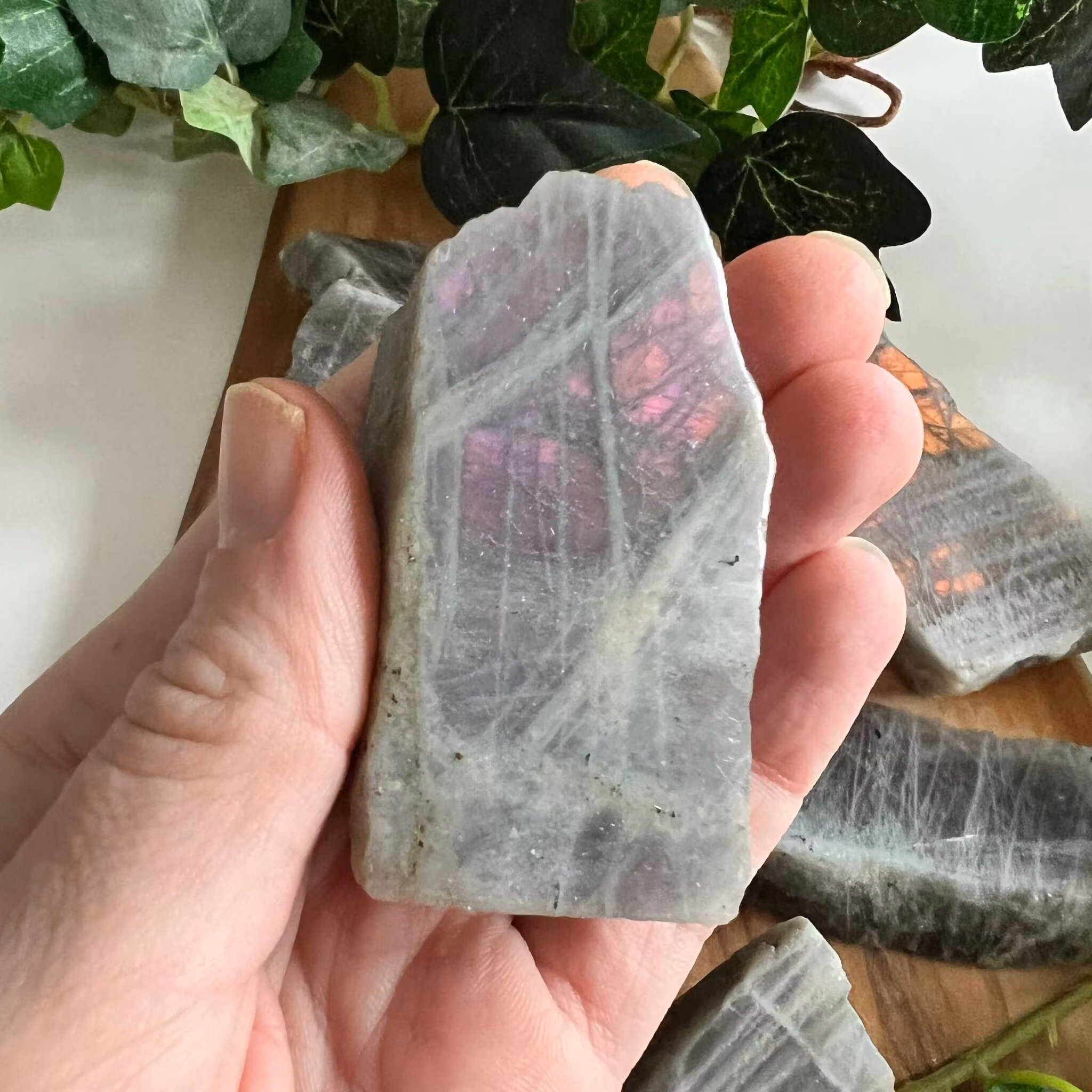 Rosa/lila skiftande labradorit skivor med en polerad sida och en rå sida.