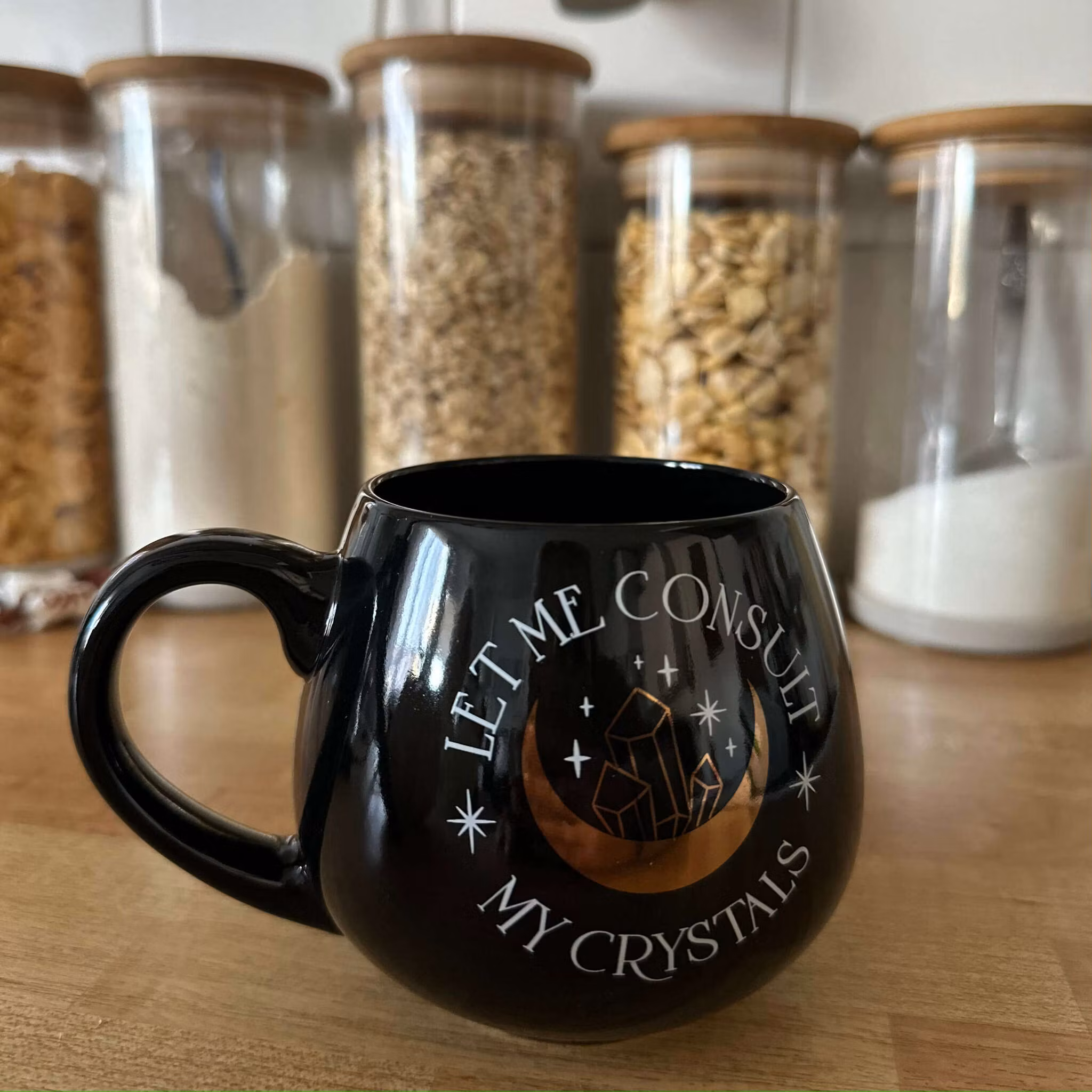 Vacker svart mugg med texten "Let me consult my crystals".