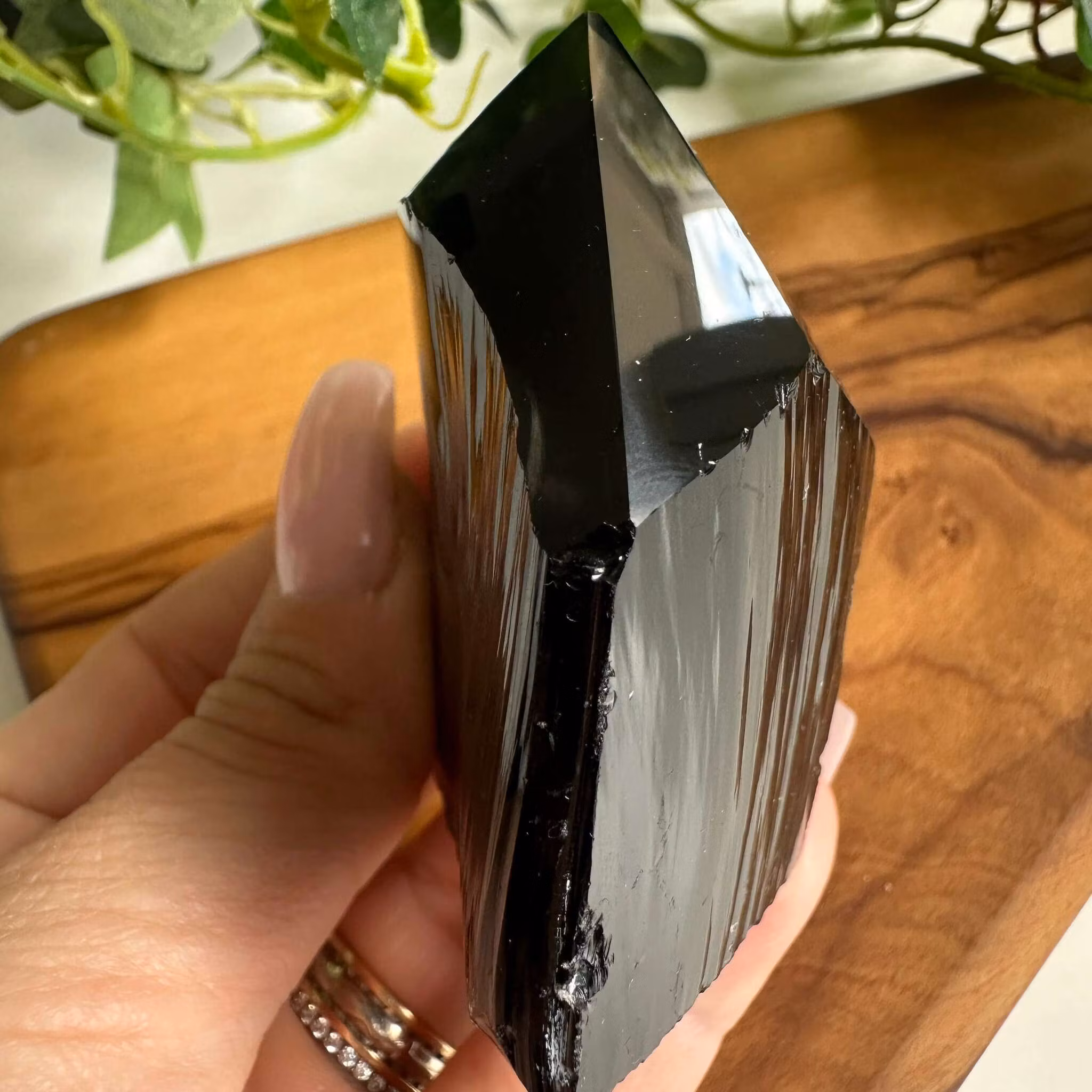 Jätte fin stående spets i svart Obsidian med råa sidor.